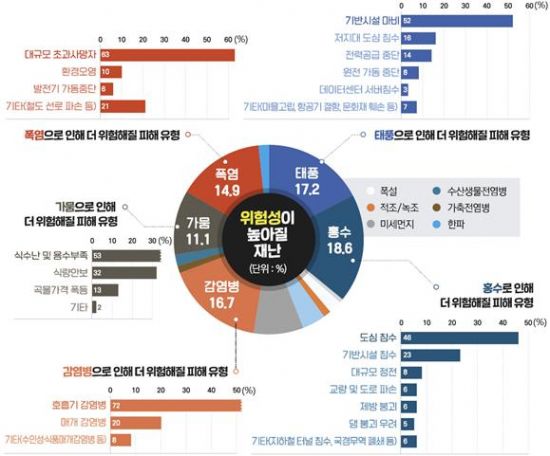 연구에 참여한 전문가 150명 중 60%는 미래 기후변화가 부정적인 시나리오에 따라, 40%는 긍정적인 시나리오에 따라 진행될 것으로 예상했다. 기후변화로 위험성이 증가될 미래 재난 및 피해 유형으로 홍수(18.6%)로 인한 도심침수가 1위에 꼽혔다. 2위는 태풍(17.2%)으로 인한 기반시설 마비, 3위는 감염병(16.7%)으로 인한 호흡기 감염병, 4위는 폭염(14.9%)으로 인한 대규모 초과사망자, 5위는 가뭄(11.1%)으로 인한 식수난 및 용수부족 순으로 전망됐다.