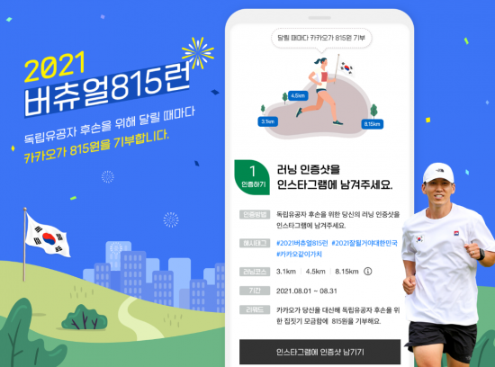 카카오의 사회공헌 플랫폼 카카오같이가치는 광복 76주년을 맞아 이달 31일까지 '2021 버츄얼 815런' 인스타그램 인증 기부 캠페인을 진행한다.