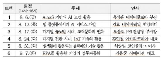 네이버클로바, 네이버웨일, 아카라코리아 등 6개 디지털 선도 기업의 전문가가 연사로 참여해 디지털 전환을 위한 핵심기술 도입사례와 조직문화 방향성에 대해 소개할 예정이다. 세미나는 웹 플랫폼에서의 AI 서비스개발, 디지털 뉴노멀 시대 조직문화의 변화, 디지털 전환 시대 사물인터넷 기술의 활용, AlaaS (서비스형 AI)기반의 AI 모델 활용 등 총 6가지 주제를 다룰 예정이다.