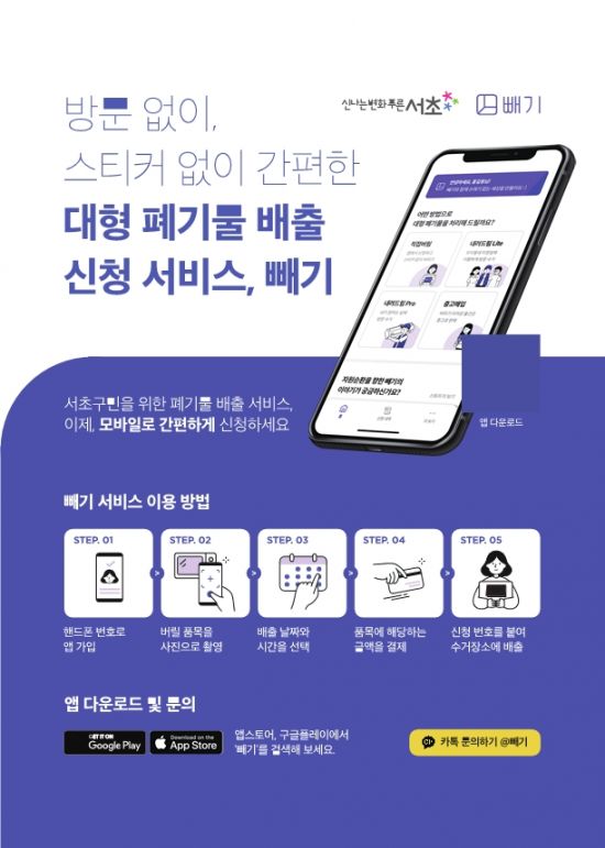 [아시아경제 박종일 기자] 서초구(구청장 조은희)는 대형폐기물 배출신고 증진을 위해 ‘㈜같다’가 운영하는 대형폐기물을 손쉽게 신고하고 결제하는 모바일 앱 ‘빼기’의 운영을 지난 2일부터 시작했다.