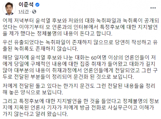 이 대표는 이날 사회관계망서비스(SNS)를 통해 "어제 저녁부터 윤석열 후보와 저와의 대화 녹취파일과 녹취록이 공개되었다는 이야기부터 모 언론과의 인터뷰에서 특정후보에 대한 지지발언을 제가 했다는 정체불명의 내용이 돈다고 한다"면서 "우선 유출되었다는 녹취파일이 존재하지 않으므로 당연히 작성하고 유출된 녹취록도 존재하지 않는다"고 밝혔다.