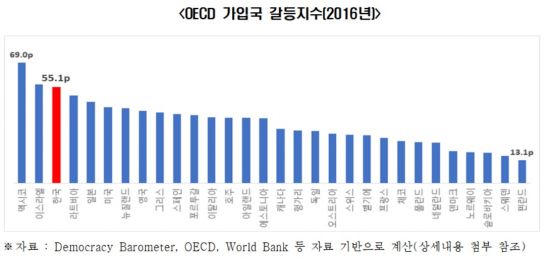 한국의 갈등관리지수는 2016년 기준 OECD 30개국 중 27위로 나타났다. 이는 멕시코(30위), 그리스(29위), 헝가리(28위)에 이어 낮은 순위다. 한국의 갈등지수는 2008년 기준 OECD 30개국 중 4위에서 2016년 3위로 한 계단 올라 갈등이 상대적으로 심화된 것으로 확인됐다. 전경련 관계자는 "정부효율성, 규제의 질 등으로 구성된 갈등관리지수가 낮다는 것은 갈등을 관리하기 위한 제도적·재정적 인프라 수준이 낮음을 의미한다"고 말했다.