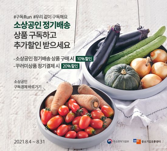 소상공인 상품 정기결제를 선택하면 꾸러미 상품은 20%, 단일 상품은 10% 할인되는 쿠폰을 제공한다. 꾸러미는 보통 일반가보다 17~31% 할인된 3만~5만원대로 선보이는데, 여기에 추가로 정기배송 꾸러미 20% 할인쿠폰을 적용하면 최대 47%까지 할인받을 수 있다. 구독Run 정기배송 주기는 ▲1주에 한 번 ▲2주에 한 번 ▲1달에 한 번 중 선택할 수 있다.