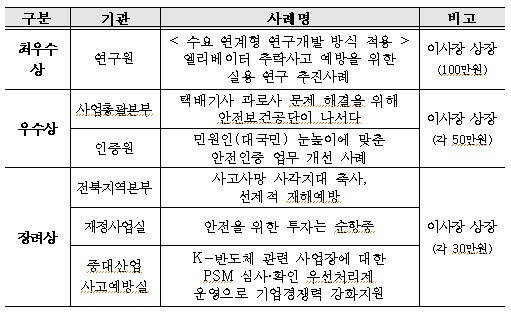 최우수상은 ‘엘리베이터 추락사고 예방을 위한 실용 연구 추진사례’로, 주요 수요자인 국내 4대 엘리베이터 제조사와 협업해 국내 최초로 ‘엘리베이터 설치용 시스템 비계’를 개발했다.