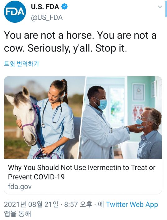 미 FDA는 이날 트위터에 "여러분은 말도, 소도 아니다. (동물용 이버멕틴의 복용을) 멈춰라"라는 글과 함께 미국에서 동물용 구충제로 흔히 쓰이는 이버멕틴을 코로나19 예방·치료제로 쓰면 안 되는 이유를 자세히 담은 FDA 홈페이지 링크를 게시했다.