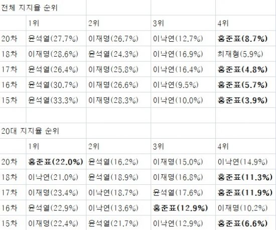 위 표는 여야 전체 대선주자 12명을 순서 없이 불러준 뒤 1명을 고르게 한 결과입니다. 19차에는 이 설문 항목이 없어 뺐습니다. 윤석열과 이재명이 다른 이들을 여유 있게 따돌리며 1,2위를 번갈아 차지합니다. 3위는 이낙연으로 고정돼 보이고요. 홍준표는 4위권이지만 지지율은 한참 떨어집니다. 물론 15차 조사에서 3.9%에 불과하던 지지율이 20차 때 8.7%까지 올랐으니 상승하긴 했습니다.