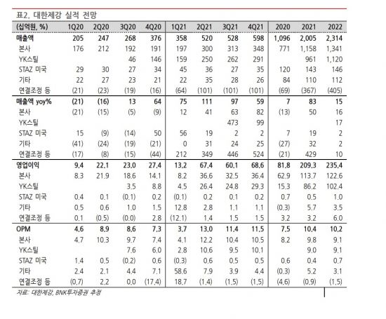 김 연구원은 "YK스틸은 1분기 NP 45억원을 기록했으나, 2분기에는 NP 211억원으로 수익성이 3배 상승했다"며 "본사와 YK스틸 모두 철근 가격 급등으로 실적이 개선된 가운데, YK스틸은 유통향 판매 비중이 높아 2분기 실적 개선 폭이 더 컸던 것으로 판단된다"고 설명했다.