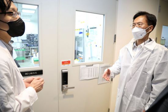 [아시아경제(대전) 정일웅 기자] 특허청은 9일 김용선 특허청 차장이 경기도 성남시 소재 SK바이오사이언스를 찾아 ‘mRNA 백신’ 특허분석 설명회를 가졌다고 밝혔다. 설명회는 mRNA 백신 생산 공정별 주요기술과 핵심특허, 분쟁현황 등을 분석한 결과를 공유하고 백신 개발·생산과정에서 예산되는 공정별 특허 이슈를 짚어보는 시간으로 진행됐다. 김 차장이 설명회를 마친 후 SK바이오사이언스 관계자의 안내를 받으며 백신 연구개발 현장을 둘러보고 있다. 특허청 제공