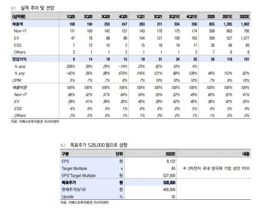 [아시아경제 이선애 기자] 이베스트투자증권은 13일 에코프로비엠의 투자의견 '매수'를 유지하고 목표주가를 52만8000원으로 상향 조정한다고 밝혔다. 이는 2022년 기준 국내 2차전지 양극재 기업 상단 주가수익비율(PER Multiple)을 적용한 것이다.