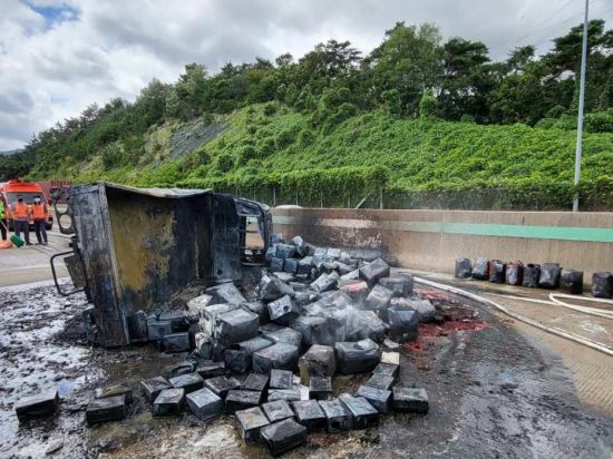 27일 부산경찰청에 따르면 이날 낮 12시 3분께 부산 기장군 장안읍 장안IC 100m 지점에서 1톤 화물차가 전복되면서 불붙는 사고가 발생했다.