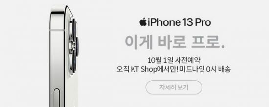 KT는 전국 KT 매장과 공식 온라인몰 KT샵에서 애플의 신규 스마트폰인 아이폰13 4종의 사전예약을 10월 1일부터 시작하며 8일에 공식 출시한다고 30일 밝혔다. KT샵에서는 10월 1일 0시 1분부터 사전예약이 가능하다.