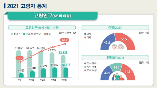 2일 통계청이 최근 발표한 '2021 고령자 통계'에 따르면 올해 기준 65세 이상 고령인구는 전체 인구의 16.5%로 집계됐다. 이는 2025년 20.3%로 늘어난 뒤 2030년 25%, 2040년 33.9%, 2050년 39.8%, 2060년 43.9%가 될 것으로 각각 전망됐다.