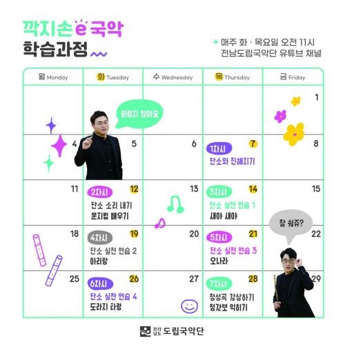 [아시아경제 호남취재본부 김춘수 기자] 전남도립국악단(예술감독 류형선)은 유튜브 채널을 통해 오는 7일부터 28일까지 매주 화, 목요일 오전 11시 온라인 교육 프로그램 ‘깍지 손 e 국악’ 단소편을 공개한다고 4일 밝혔다.