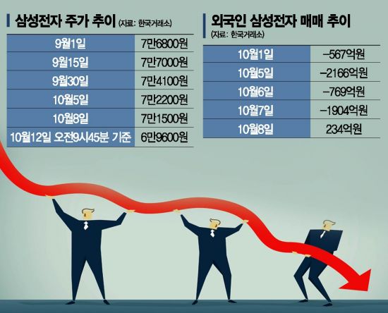 외국인의 매도가 삼성전자의 주가를 끌어내리고 있다. 외국인은 이달 들어 전거래일까지 삼성전자를 5178억원 순매도하며 가장 많이 팔았다. 이달 들어 단 하루만 제외하고 모두 매도세를 보였다.