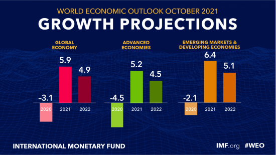 이 가운데 선진국 소비자 물가지수는 2.4%에서 2.8%, 신흥국 물가는 5.4%에서 5.5%로 상향 조정됐다. IMF는 물가에 대해 높은 인플레이션이 일시적이라는 미국 연방준비제도(Fed)와 경제학자들의 평가에 동의하지만 예상 외로 회복기에 상승세가 유지될 수 있는 위험도 높아지는 중이라고 경고했다.
