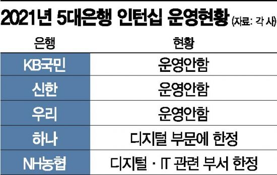 14일 금융권에 따르면 KB국민·신한·하나·우리·NH농협은행 중 인턴십 제도를 공식적으로 운영하고 있는 곳은 하나은행과 농협은행이다. 두 곳을 제외한 나머지 금융사는 수년째 인턴 전형을 운영하지 않거나 서포터즈 형식의 대외활동을 운영하는 식으로 대체하고 있다.