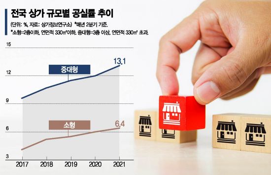 상황이 이렇다보니 상가 공실률은 계속 높아지고 있다. 상가정보연구소에 따르면 전국이 3층 이상, 연면적 330㎡ 초과 중대형 상가 공실률은 코로나19가 본격화한 지난해 2분기 12.0%에서 같은 해 4분기 12.7%로 올랐으며 올해 2분기에는 13.1%까지 올랐다. 서울 지역 중대형 상가 2분기 공실률은 9.5%로 관련 통계를 집계하기 시작한 2013년 이후 최고치를 기록 중이다.
