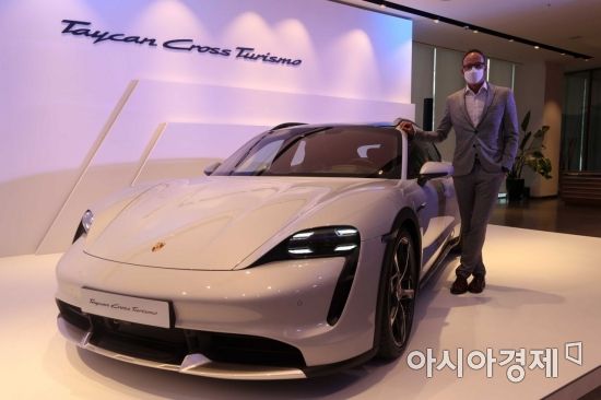 홀가 게어만 포르쉐코리아 대표가 14일 서울 강남구 포르쉐 스튜디오 청담에서 전기차 ‘타이칸 크로스 투리스모’와 함께 포즈를 취하고 있다. /문호남 기자 munonam@