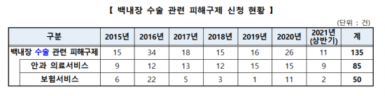 21일 한국소비자원은 2015년부터 올해 6월까지 1372소비자상담센터에 접수된 백내장 수술 관련 피해구제 신청 135건 중 비용이 확인된 37건을 분석한 결과 이같이 조사됐다고 밝혔다.
