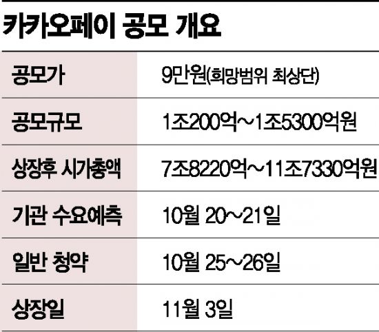 기관 수요예측과 일반 청약에서 좋은 성적을 냈지만, 증권사들은 전망은 엇갈린다. 카카오페이 시가총액은 공모가 기준 11조7330억원으로 따상이 되면 30조5059억원이 된다. 성공할 경우 형제 격인 카카오뱅크의 시총 29조9788억원(10월29일 종가 기준)보다 더 큰 규모다. 기아(34조4964억원)에 이어 코스피 시가총액 10위에 해당한다.