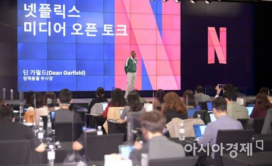 딘 가필드 넷플릭스 정책총괄 부사장이 4일 서울 종로구 JW메리어트 동대문 스퀘어 서울 호텔에서 열린 미디어 오픈 토크에서 인사말을 하고 있다./김현민 기자 kimhyun81@