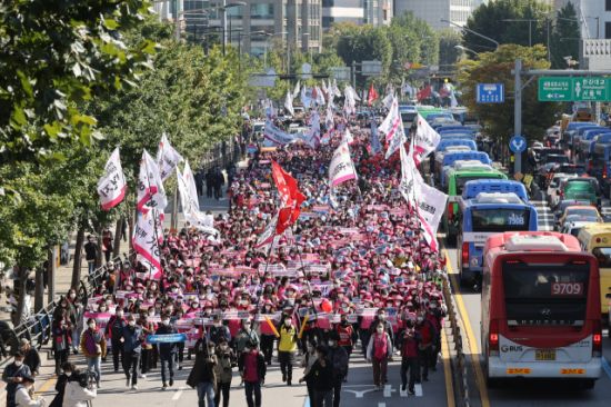 전국민주노동조합총연맹(민주노총) 조합원들이 20일 서울 서대문역 네거리에서 '10·20 민주노총 총파업 대회'를 열고 '5인 미만 사업장 차별 철폐·비정규직 철폐, 모든 노동자의 노조활동 권리 쟁취' 등을 촉구하고 있다./김현민 기자 kimhyun81@