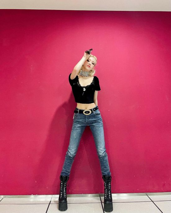 사진 속 전소미는 스키니진에 블랙 크롭티셔츠를 매치해 탄탄한 몸매를 자랑했다.