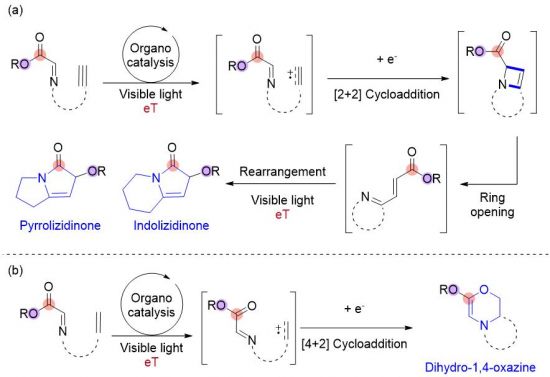 연구팀이 개발한 방식은 기존 방식과 달리 금속 촉매 대신 저에너지 가시광선인 청색광에 의해 활성화되는 유기 광촉매를 사용했다. 산화환원 중립적인 반응이라 별도 산화환원제가 불필요하며, 상온에서 합성 가능한 환경 친화적인 방법이다. 이 합성법을 이용해 알카인과 이민을 반응시켜 오각 질소고리 두 개가 접합된 피롤라이지딘 구조, 오각 질소고리와 육각 질소고리가 접합된 인돌리지딘(Indolizidine) 구조를 얻었다. 피롤라이진딘과 인돌리지딘은 각각 항 부정맥제, 항암 후보물질의 기본 구조다. 또 알카인 대신 알켄을 사용하면 옥사진 유도체를 얻을 수도 있다.