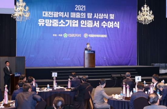 대전시는 11일 유성구 도룡동 소재 호텔 ICC에서 ‘제15회 매출의 탑 시상식 및 유망중소기업 인증서 수여식’을 가졌다고 밝혔다.