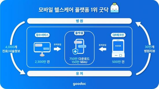 접수 태블릿, 키오스크 등 O2O서비스를 통해 병원에서 ‘굿닥’ 브랜드를 경험한 환자들이 점차적으로 증가하면서 ‘굿닥’ 모바일 앱으로의 유저 유입도 증가하고 있다. 지난 10월 기준, 굿닥의 누적 앱 다운로드 수는 750만에 달한다. 월 평균 사용자 수는 150만명으로, 국내 모바일 헬스케어 플랫폼 중 압도적인 선두 지위를 확보하고 있다.