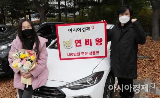 13일 경기 하남시 한국도로공사 수도권본부에서 열린 '2021 아시아경제 연비왕 대회'에서 전체 연비왕을 수상한 민병우 씨가 부인 김세영씨와 대회에 참가한 차량 2018년식 아반떼스포츠 차량 앞에서 포즈를 취하고 있다./윤동주 기자 doso7@