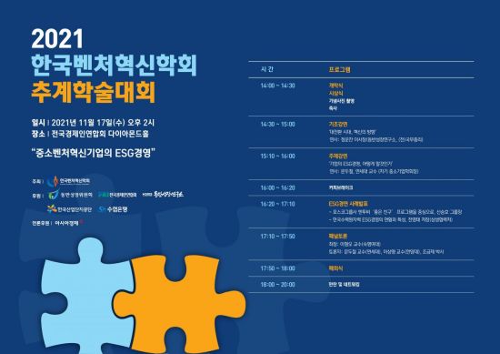 한국벤처혁신학회는 이날 오후 2시 서울 여의도 전국경제인연합회 회관 다이아몬드홀에서 '중소벤처혁신기업의 ESG경영'을 주제로 추계학술대회를 연다. 아시아경제의 언론후원으로 열리는 이번 행사는 이의철 아시아경제 대표가 개막식 축사를 맡았다.