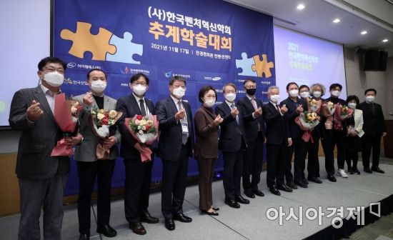 17일 서울 여의도 전국경제인연합회관에서 ‘중소벤처혁신기업의 ESG경영’을 주제로 열린 한국벤처혁신학회 추계학술대회 시상식에서 내빈들과 수상자들이 기념촬영을 하고 있다. 왼쪽 네번째부터 전인오 한국벤처혁신학회장, 한무경 국민의힘 의원, 정운찬 동반성장연구소 이사장, 이의철 아시아경제 대표./김현민 기자 kimhyun81@