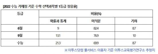 반면 확률과통계 응시자 점유율은 6월에 9%에 불과했으나 9월에는 13.1%, 수능에서는 21.3%로 추정된다.