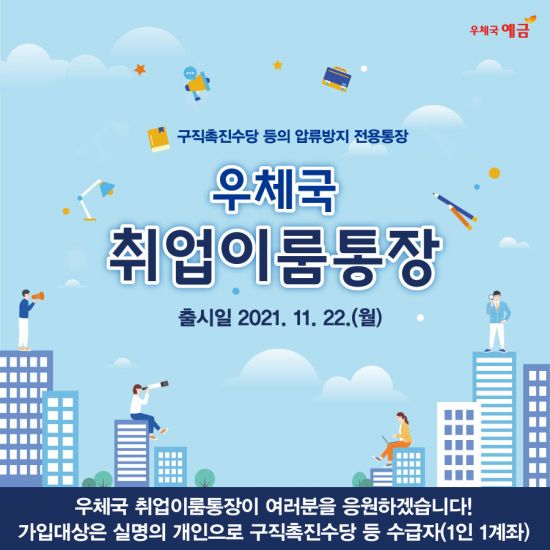 ‘우체국 취업이룸통장’에는 고용노동부에서 취업취약계층에게 제공하는 구직촉진수당 등에 한해 입금이 가능하고, 예금에 대한 각종 압류를 금지해 대상자의 생활안정을 지원한다. 가입대상은 구직촉진수당 수급권자 중 희망자에 한해 가능하며, 1인 1계좌를 원칙으로 적용이율은 기본이율 연 0.1%에 더불어 이자 납입기간 등에 따라 최고 연 0.2%p의 우대이율을 적용받을 수 있다.