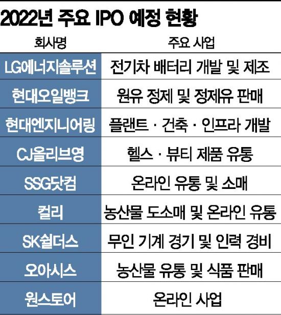 새해가 바뀌면 IPO 시장은 다시 뜨거워질 것으로 보인다. LG에너지솔루션·현대오일뱅크·현대엔지니어링·CJ올리브영·SSG닷컴·컬리·SK쉴더스(구 ADT캡스)·오아시스·원스토어 등이 공모주 시장에 줄줄이 등판할 채비다.