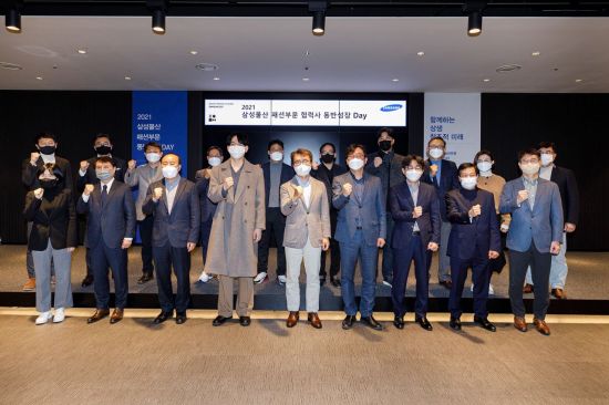 24일 서울 강남구 도곡동에 위치한 삼성물산 패션부문 본사 사옥에서 진행된 ‘2021년 동반성장데이’ 행사에서 이준서 삼성물산 패션부문장(앞줄 왼쪽 다섯 번째)과 임직원, 협력사 대표들이 기념 촬영을 하고 있다.