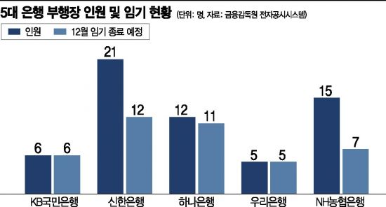 NH농협은행도 15명 부행장 중 장승현·오경근·지준섭·김유경·김형신·박상국·신인식 등 7명의 임기가 다음달 만료된다. 홍명종 부행장의 임기도 내년 2월 끝난다. 권준학 행장이 올해 ‘고객중심 디지털금융’과 ‘농협금융 역할 강화’를 강조하고 있는 만큼 연장보다는 교체 가능성이 점쳐진다.