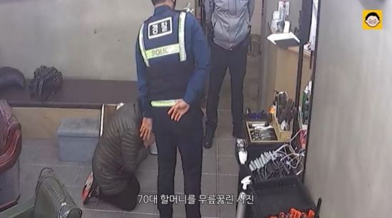 영상에 따르면 이 사진에 등장한 무릎 꿇은 여성은 70대 B씨로, 그는 앞서 한 업체의 전단을 미용실 우편함에 넣었다. 그러나 이를 목격한 미용실 사장 A씨가 전단에 적힌 업체에 직접 연락해 항의를 했다. 업체 사장 C씨는 A씨에게 사과의 뜻을 밝혔지만, A씨는 "B씨에게 직접 사과를 받아야겠다"고 주장했다.