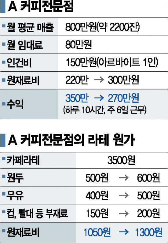 A 커피전문점을 운영하는 백승곤씨(37·가명)는 "임대료와 인건비 등을 제외하고 나면 월 평균 매출 800만원에서 250만원 정도가 남는데, 이를 시급으로 환산해보니 1만1000원에 불과하다"며 "원두 가격이 내년 초에 또 오르고, 인건비마저 오르게 되면 아르바이트보다 시급 수준이 떨어지는 상황이 된다"고 설명했다.