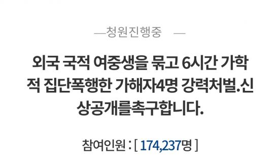청원인은 “외국 국적 여중생을 집단 폭행하고 학대한 또래 중학생 4명이 경찰에 붙잡혔다”며 “가해 학생들은 폭행하면서 피해자의 국적을 비하했다. 경찰 조사 결과 모두 술에 취한 상태였다”고 주장했다.
