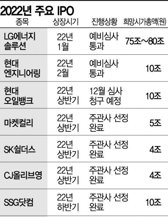내년에도 역대급 IPO 시장이 열릴 것으로 전망된다. 세계 2위 전기차 배터리 제조업체인 LG에너지솔루션을 비롯해 현대엔지니어링과 현대오일뱅크, SSG닷컴 등 시총 10조원을 목표로 한 IPO가 기다리고 있다. LG화학에서 물적분할한 LG에너지솔루션은 지난달 30일 상장예비심사를 통과, 내년 1월 상장이 예상된다. 공모가 기준 시총은 10조9000억~12조7000억원으로 알려졌는데, 시장에선 글로벌 1위인 중국 배터리업체 CATL의 시가총액이 약 290조원에 달하는 만큼 LG에너지솔루션의 기업가치가 80조원대가 가능할 것으로 보고 있다.