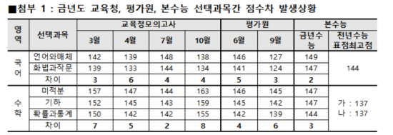 수학영역에서는 이과학생들이 주로 응시하는 미적분과 기하를 택한 경우 표준점수 최고점이 147점, 문과학생들이 많이 선택하는 확률과통계는 144점으로 나타났다. 6월 모평에서는 미적분 146점·확률과통계 142점으로 4점차, 9월 모평에서는 145점·139점으로 6점차였다.