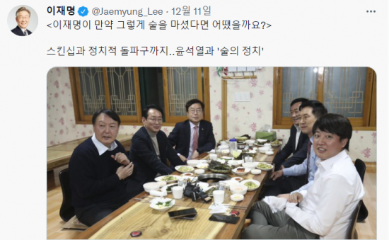 이 후보는 11일 자신의 트위터에 윤 후보가 정치적 고비 때마다 술자리를 통해 위기를 돌파해왔다는 내용의 기사를 소개하며 "이재명이 만약 그렇게 술을 마셨다면 어땠을까요?"라고 반문했다.