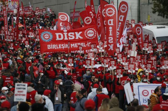 터키 이스탄불에서 12일(현지시가) 정부의 경제정책을 성토하는 노조 시위대가 거리를 행진하고 있다. 터키 리라화 가치가 사상 최저 수준으로 하락한 가운데 레제프 타이이프 에르도안 대통령은 지난 8일 국민들에게 정부의 경제 정책을 믿고 따라달라고 촉구했다. [이미지출처=연합뉴스]
