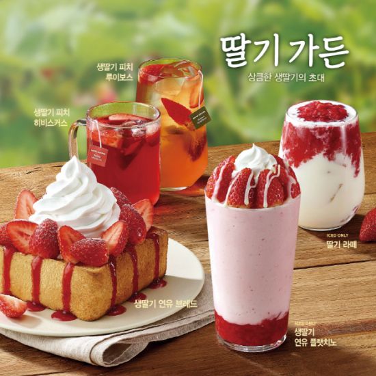 딸기 음료는 ▲딸기 라떼 ▲생딸기 토핑이 듬뿍 올라간 생딸기 연유 플랫치노 ▲생딸기 피치 히비스커스 ▲생딸기 피치 루이보스다.