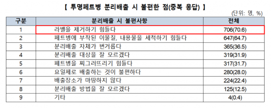 투명 페트병의 라벨이 잘 분리되지 않아 전부 제거되지 않았을 경우 42.7%는 '미제거 상태 그대로 플라스틱 수거함에 배출한다'고 답해 상당수 투명 페트병이 라벨이 제거되지 않은 채 배출되는 것으로 분석됐다. 페트병에서 제거한 라벨의 배출 방법을 조사한 결과 투명 페트병 전용수거함이나 플라스틱 수거함에 잘못 배출하는 경우가 44.0%였다. 투명 플라스틱 아이스컵이나 투명 페트팩을 각각 투명 페트병 전용수거함에 잘못 배출하는 경우도 각각 32.1%, 31.7%였다. 라벨은 비닐 수거함에, 투명플라스틱 아이스컵이나 투명 페트병은 플라스틱 수거함에 배출해야 한다.