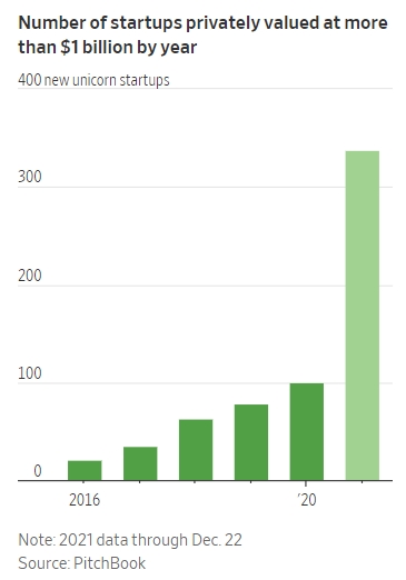 식품 배달 스타트업 그럽마켓은 애초 5000만달러 자금 유치를 목표로 했는데 투자 수요가 몰리면서 11월까지 2억4000만달러가 넘는 자금을 확보했다. 기업 가치도 12억달러가 넘는다는 평가를 받았다. 그럽마켓의 마이크 쉬 최고경영자(CEO)는 "예상보다 많은 자금이 극도로 빠르게 자금이 모였다"고 말했다. 금융정보업체 피치북에 따르면 올해 10억달러 이상 가치를 인정받은 유니콘 기업은 거의 340개에 육박한다. 지난해보다 3배 이상으로 늘었다.