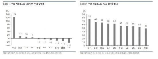 1일 유안타증권에 따르면 2021년 지주회사의 평균 주가 수익률은 8%를 기록했고, 측정한 순자산가치 대비 평균 할인율은 61%에 달했다. 주가 수익률 기준 플러스를 기록한 회사는 두산 등 극히 소수에 불과했다.