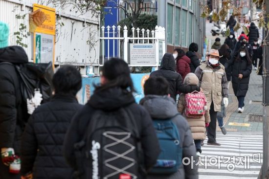 정부가 사회적 거리두기를 다시 강화하기로 결정함에 따라 오는 20일부터 수도권 모든 학교와 비수도권 과대학교, 과밀학급이 전면 등교를 중단하기로 발표한 17일 서울 한 초등학교 인근에서 학생들이 등교하고 있다./강진형 기자aymsdream@
